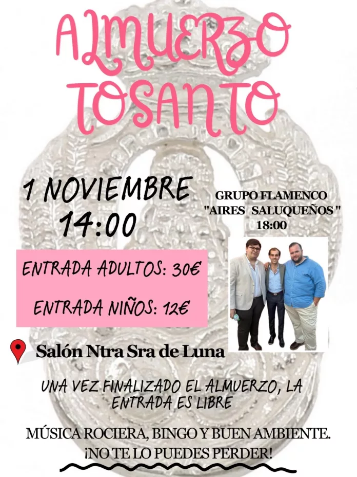 El almuerzo tuvo lugar en el salón Ntra. Sra. de Luna de la localidad, y desde las 14:00 horas, contó con un magnífico ambiente; además, a partir de las 18:00 horas, se pudo disfrutar de la actuación del grupo Aires Sanluqueños, así como de buena música rociera.