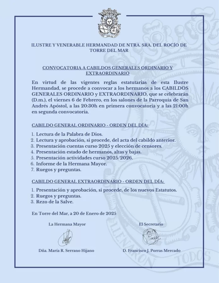 La Junta de gobierno de la Hermandad de Nuestra Señora del Rocío de Torre del Mar convoca a sus hermanos a la celebración de dos Cabildos: Ordinario y Extraordinario, el próximo viernes, 6 de febrero.