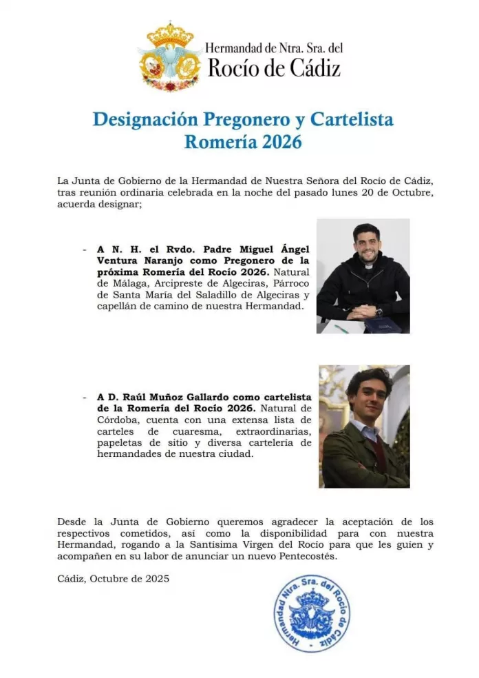 La persona que tendrá a su cargo de ilustrar el cartel de 2.026, será Raúl Muñoz Gallardo, en quien la Hermandad de Cádiz ha depositado su confianza, con la seguridad de que será una bella obra para los rocieros gaditanos a las puertas de un nuevo Pentecostés.