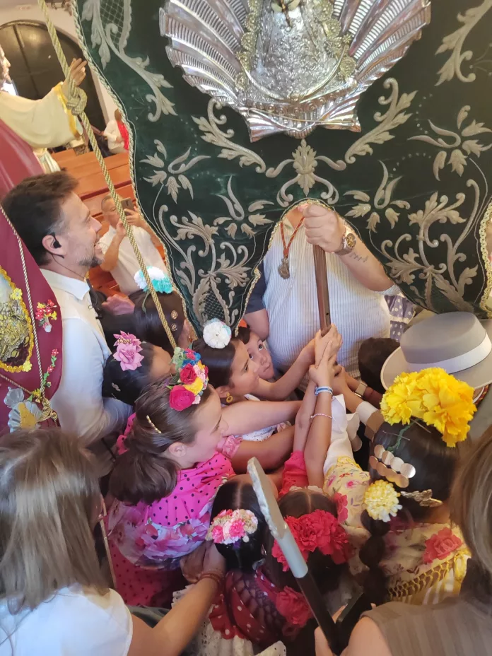 El cortejo, que partió desde el monumento a la Virgen del Rocío en la Plaza del Punto, dejó estampas inolvidables a su paso por la Plaza Niña, donde visitaron a las Hermanas de la Cruz, y la iglesia de la Concepción, antes de recogerse en la casa de hermandad bajo los sones del coro joven de Emigrantes.