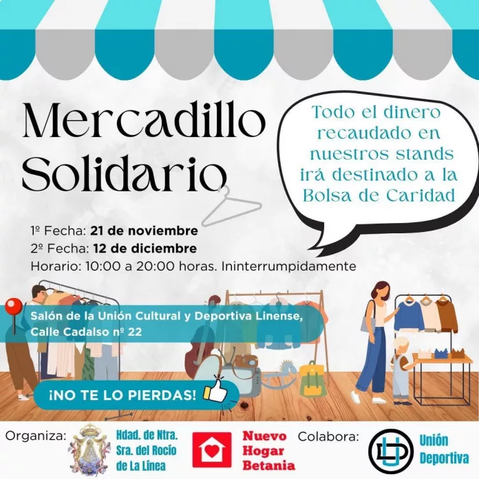 La Hermandad de Nuestra Señora del Rocío de La Línea de la Concepción, en colaboración con el nuevo Hogar Betania y la Unión deportiva de la localidad, abre hoy las puertas de su Mercadillo solidario, que permanecerá abierto de 10 de la mañana a 8 de la tarde, de manera ininterrumpida.