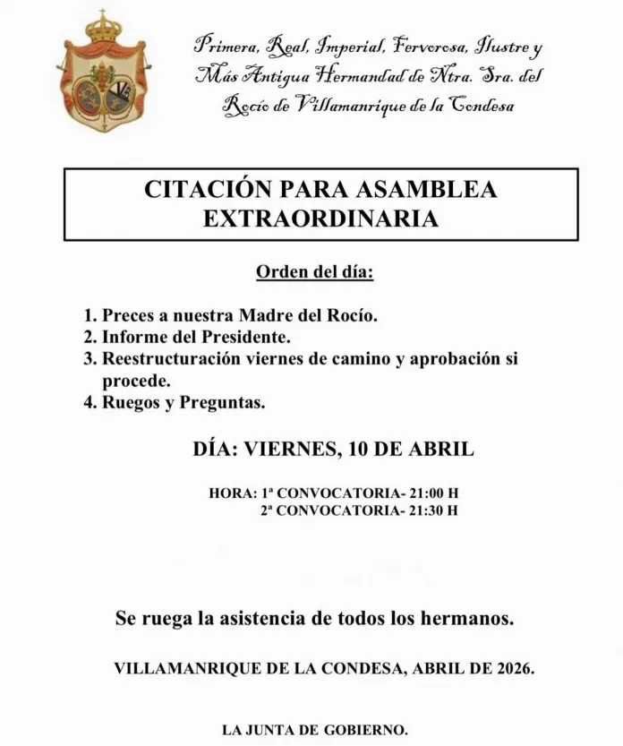 La Junta de gobierno de la Primera y Más antigua Hermandad de Nuestra Señora del Rocío de Villamanrique de la Condesa convoca a sus hermanos a la Asamblea Extraordinaria que tendrá lugar hoy, viernes, 10 de abril.