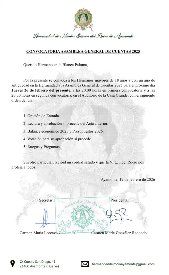 La Junta de gobierno de la Hermandad de Nuestra Señora del Rocío de Ayamonte ha convocado la Asamblea general de cuentas para hoy, jueves, 26 de febrero.