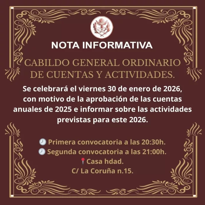 En el cabildo se aprobarán, si procede, las cuentas de 2.025 y se informarán de las actividades y presupuestos previstos para 2.026.