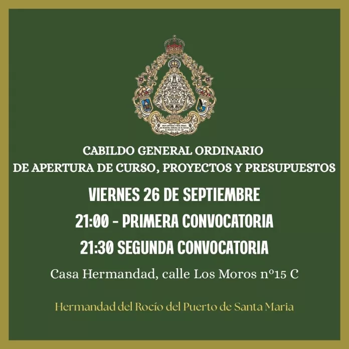 La Junta de gobierno de la Hermandad de Nuestra Señora del Rocío de el Puerto de Santa María ha convocado el Cabildo Ordinario de apertura de curso, proyectos y presupuestos.