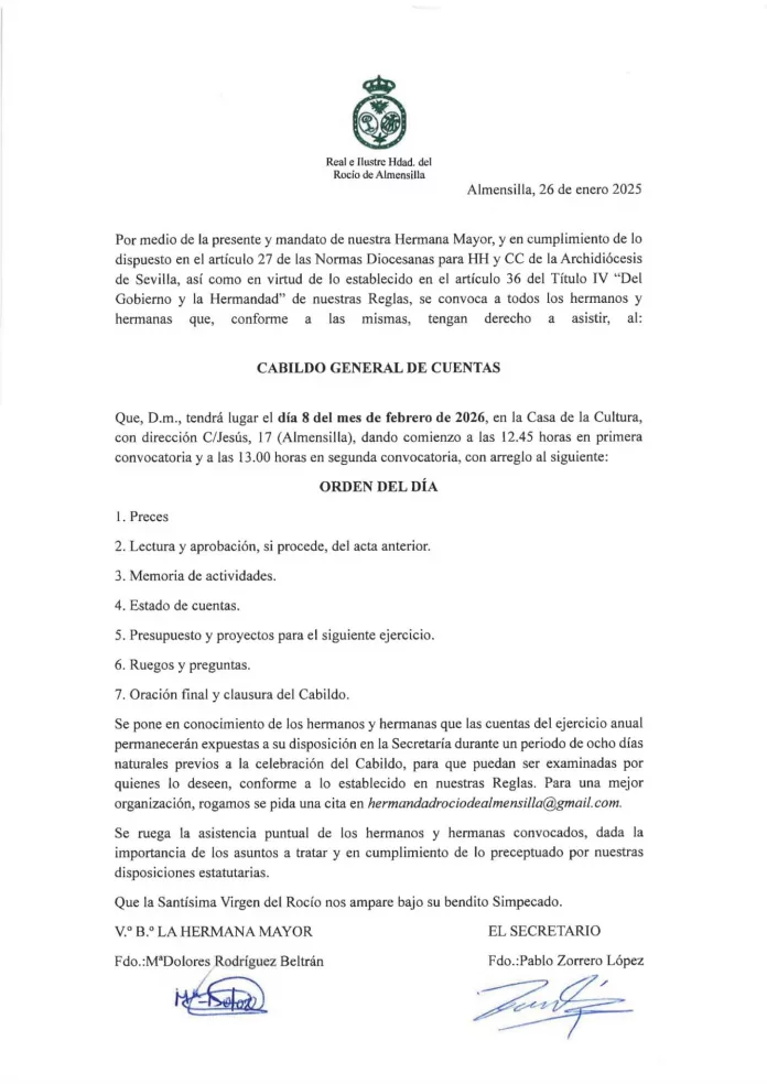 La Junta de gobierno de la Hermandad de Nuestra Señora del Rocío de Almensilla ha convocado a sus hermanos al Cabildo general de cuentas que tendrá lugar hoy, domingo, 8 de febrero.