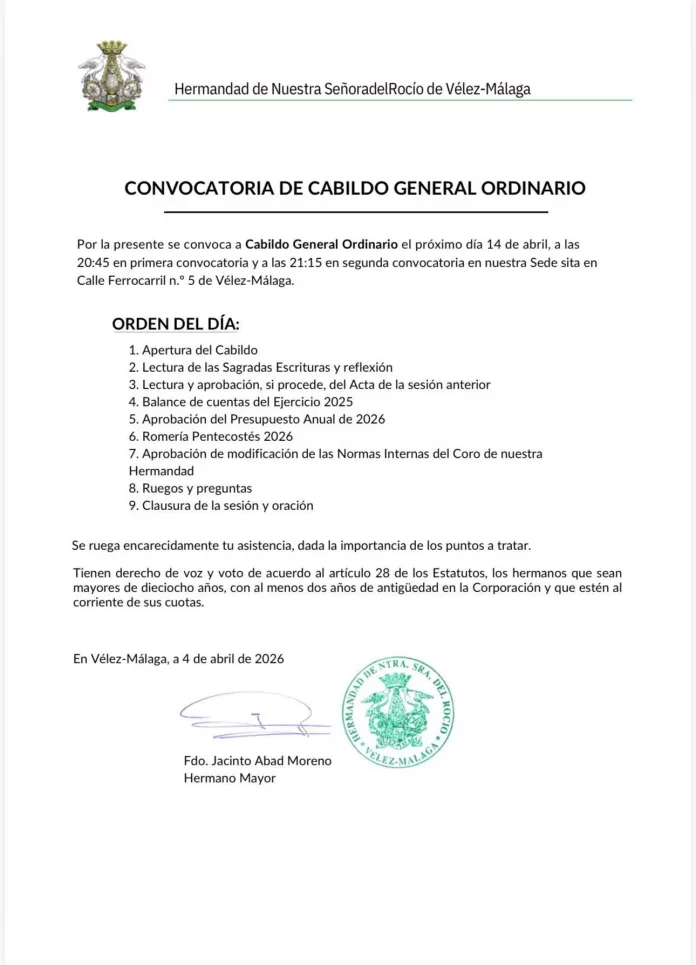 La Junta de gobierno de la Hermandad de nuestra Señora del Rocío de Vélez-Málaga ha convocado a sus hermanos, para que acudan al Cabildo general Ordinario que tendrá lugar hoy, martes, 14 de abril.