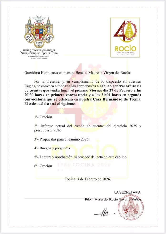 La Junta de gobierno de la Hermandad de Nuestra Señora del Rocío de Tocina ha convocado para hoy su cabildo general ordinario de cuentas.