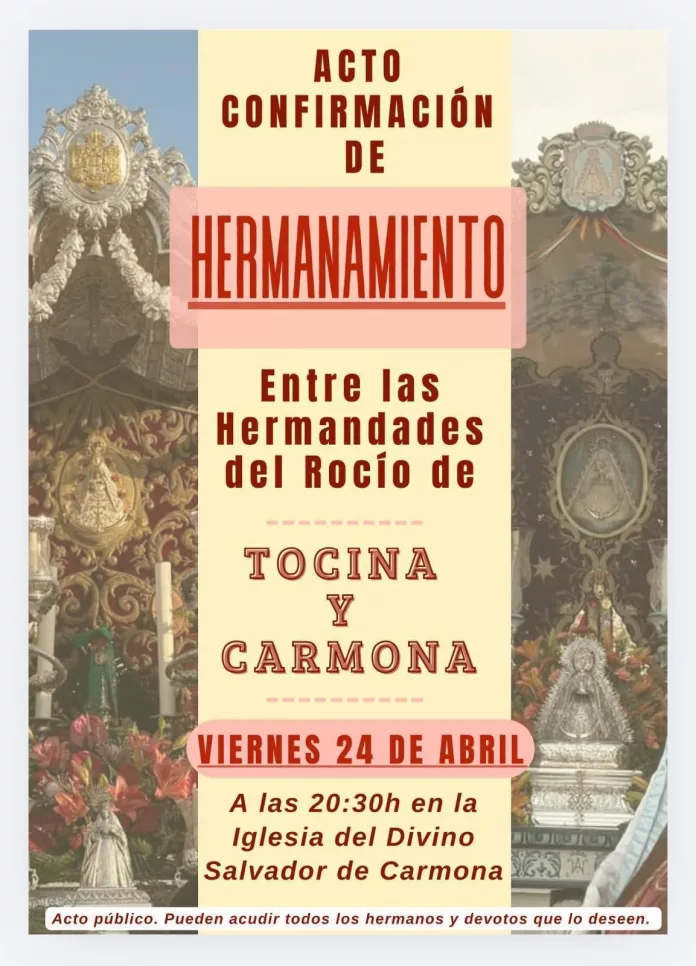 CARMONA | Las Hermandades del Rocío de Tocina y Carmona vivirán este viernes un momento histórico para sus respectivas trayectorias. La Iglesia del Divino Salvador será el escenario, a las 20:30 horas, del acto de confirmación oficial de su hermanamiento, un vínculo que refuerza los lazos de fraternidad entre ambas corporaciones.