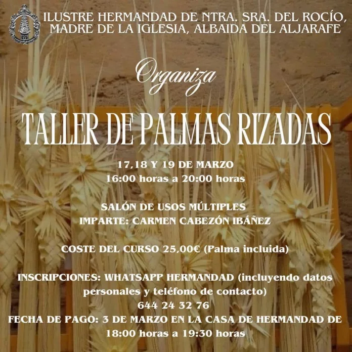 Durante los días 17, 18 y 19 de marzo, tendrá lugar un taller de palmas rizadas organizado por la Hermandad de Nuestra Señora del Rocío de Albaida del Aljarafe, que será impartido por Carmen Cabezón Ibáñez.