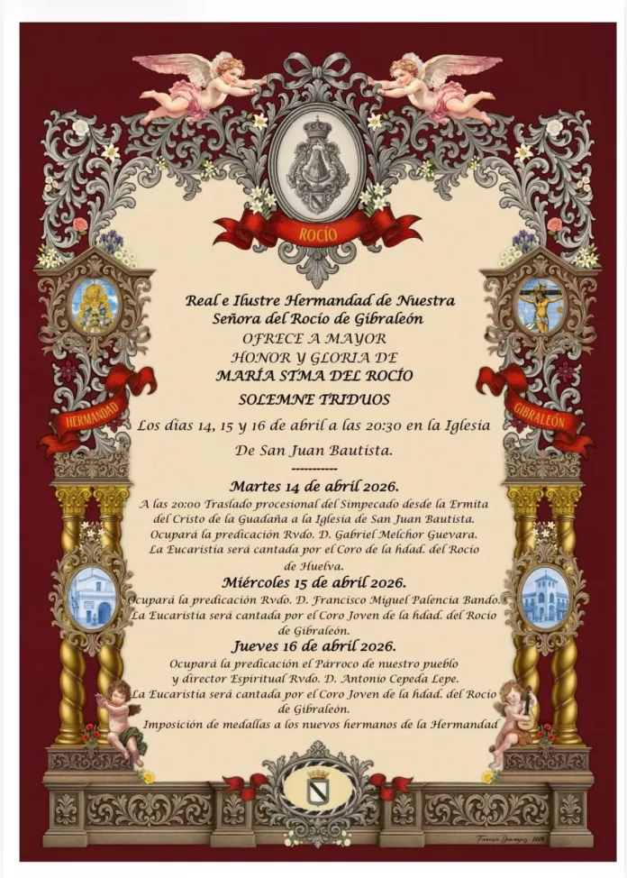 Los días 15, 16 y 17 de abril se llevará a cabo el triduo de preparación a la romería de este año de la Hermandad de Nuestra Señora del Rocío de Gibraleón.