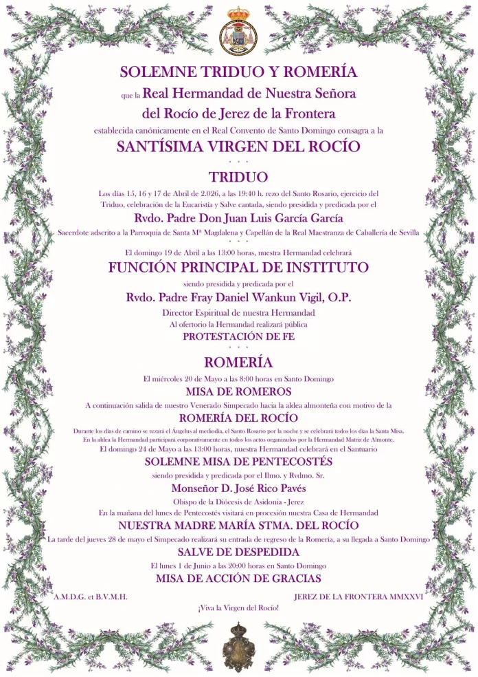Durante los días 15, 16 y 17 tendrá lugar el triduo de preparación a la romería de la Hermandad de Nuestra Señora del Rocío de Jerez de la Frontera.