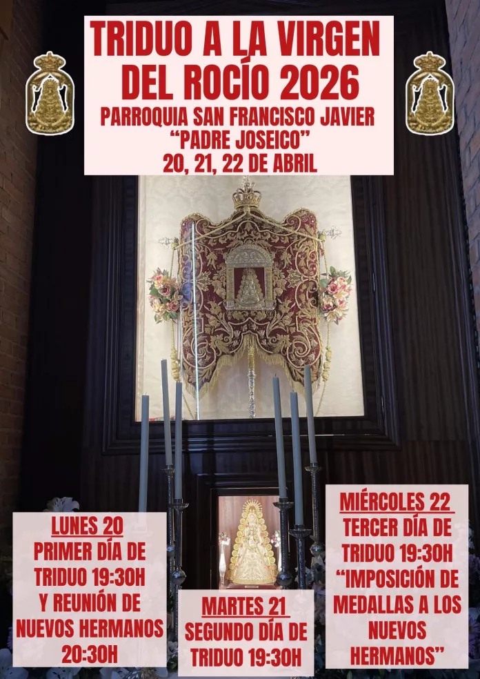 Durante los días 21, 22 y 23 de abril, tendrá lugar el triduo preparatorio de la romería de la Hermandad de Nuestra Señora del Rocío de Murcia.