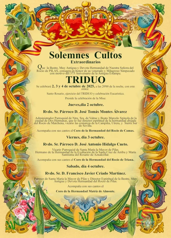 Durante los días 2, 3 y 4 de octubre, con motivo del 375 aniversario de la antigua estampa de su Simpecado, la Hermandad de Nuestra Señora del Rocío de Pilas celebrará un triduo extraordinario, en honor a la Virgen.