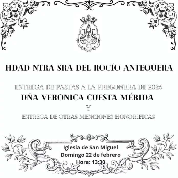 Después de la Misa, a las 13:30 horas, en la Iglesia de San Miguel, la Hermandad de Nuestra Señora del Rocío de Antequera entregará las pastas del pregón a su pregonera de este año, Verónica cuesta Mérida.