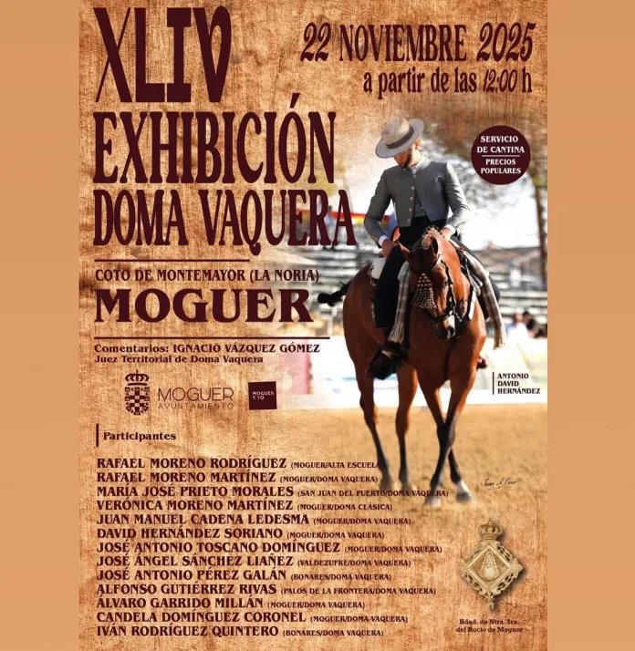 Hoy, sábado, 22 de noviembre, tendrá lugar una exhibición de doma vaquera, organizada por la Hermandad de Nuestra Señora del Rocío de Moguer, que se celebrará en el Coto de Montemayor, en La Noria.