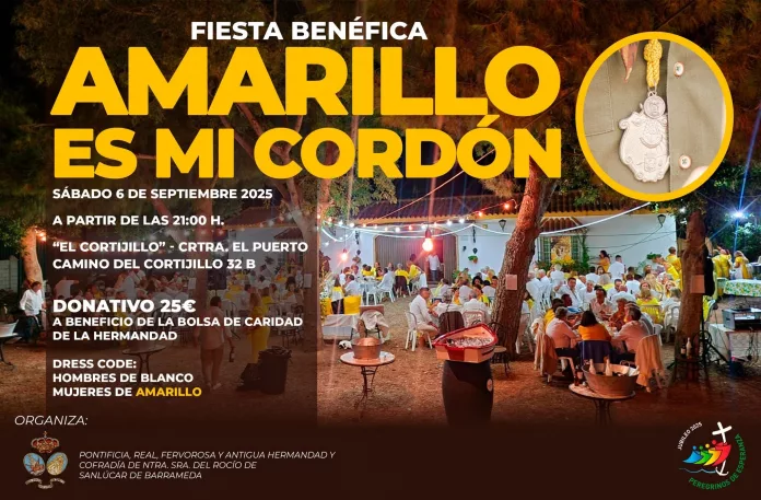 Hoy, sábado, 6 de septiembre, tendrá lugar la Fiesta benéfica organizada por la Hermandad de Nuestra Señora del Rocío de Sanlúcar de Barrameda “Amarillo es mi cordón”, a favor de la bolsa de caridad, mediante la cual se lleva a cabo una gran labor de ayuda.