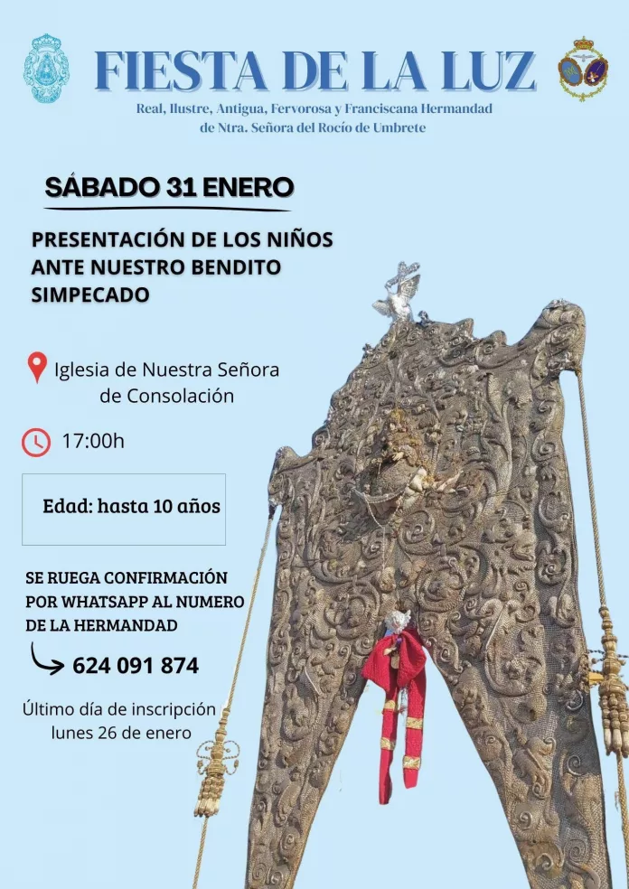 En la tarde de hoy, sábado, 31 de enero, la Hermandad de Nuestra Señora del Rocío de Umbrete celebrará la presentación de los niños a la Virgen, ante su Simpecado.