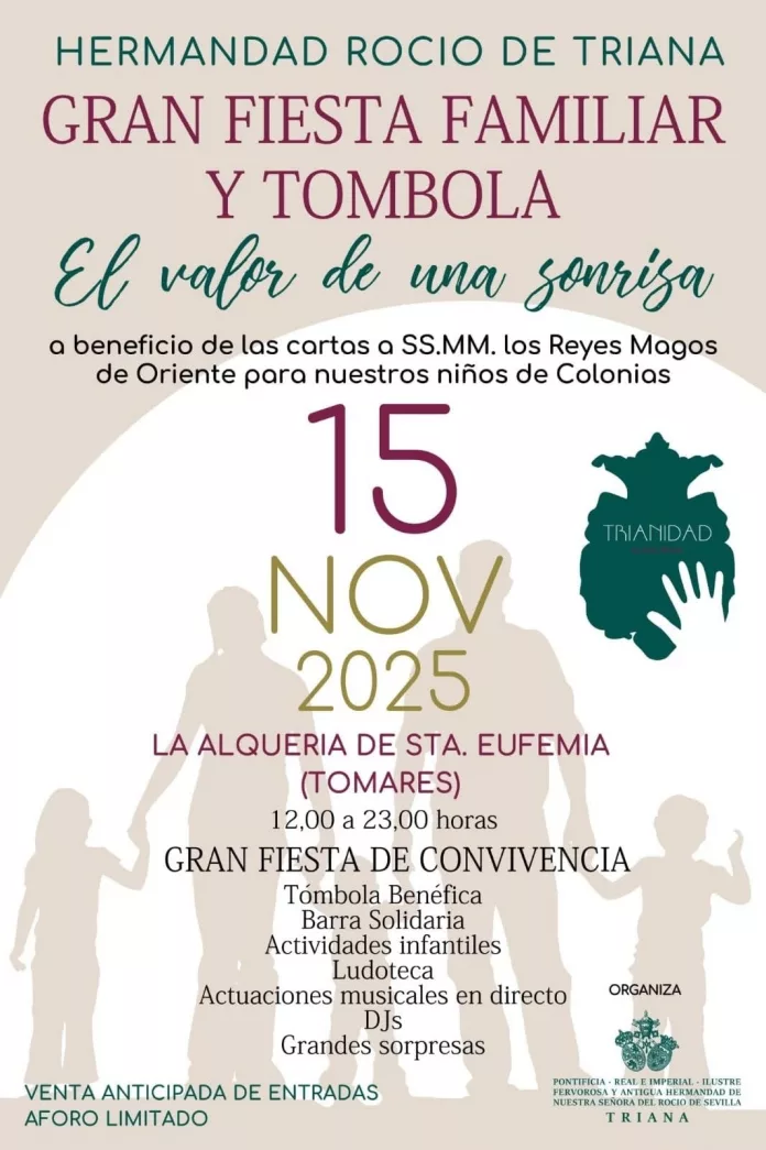 Hoy, sábado, 15 de noviembre, la Hermandad de Nuestra Señora del Rocío de Triana llevará a cabo una gran fiesta familiar y su tómbola “El valor de una sonrisa” a beneficio de los niños de las colonias de verano, para la campaña de Reyes magos.