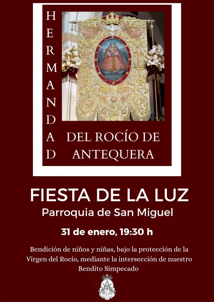 Hoy, sábado, 31 de enero, tendrá lugar la celebración de la fiesta de la luz de la Hermandad de Nuestra Señora del Rocío de Antequera, que tendrá lugar en su sede canónica, la Parroquia de San Miguel, a las 19:30 horas.