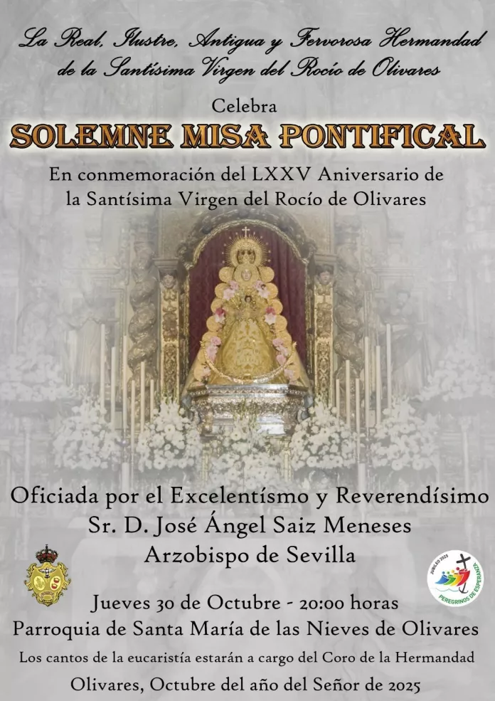 Conmemorando los 75 años de su fundación, la Hermandad de Nuestra Señora del Rocío de Olivares celebrará hoy, jueves, 30 de octubre, una Solemne Misa Pontifical, que será oficiada por el Arzobispo de Sevilla, don José Ángel Saiz Meneses.
