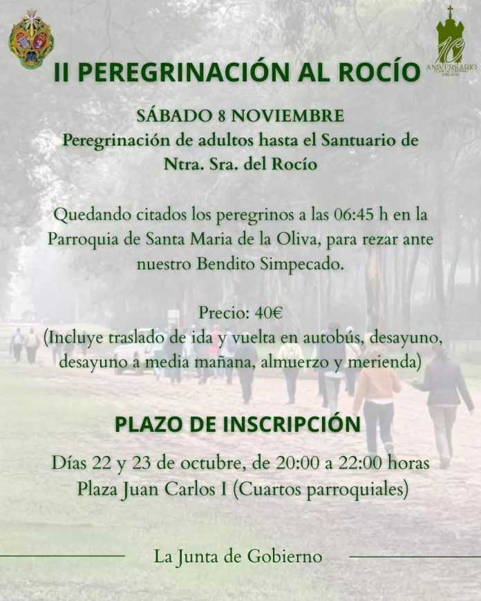 Hoy, sábado, 8 de noviembre, tendrá lugar la peregrinación andando de adultos al Rocío, de la Hermandad de Nuestra Señora del Rocío de Salteras.