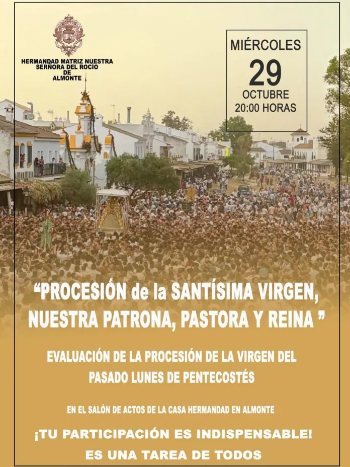 La Hermandad Matriz de Almonte convoca a los hermanos y vecinos de Almonte a la reunión de hoy para evaluar la procesión de la Virgen de este año.