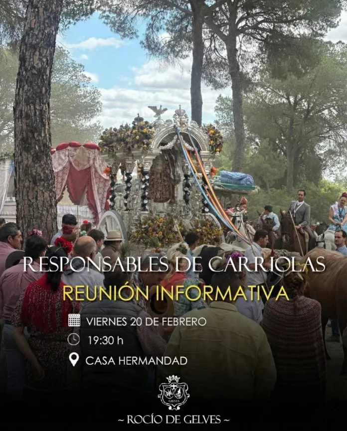 Hoy, viernes, 20 de febrero, tendrá lugar la reunión de responsables de carriolas, convocada por la Junta de gobierno de la Hermandad de Nuestra Señora del Rocío de Gelves.