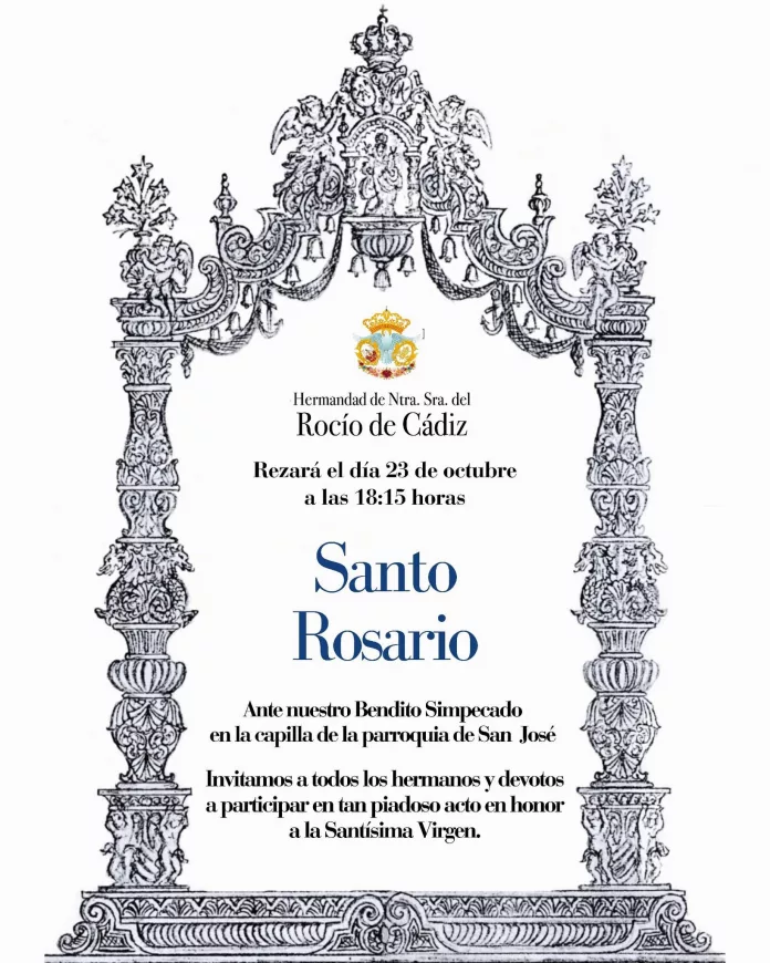 Hoy, jueves, 23 de octubre, tendrá lugar el rezo del Santo Rosario de la Hermandad de Nuestra Señora del Rocío de Cádiz.