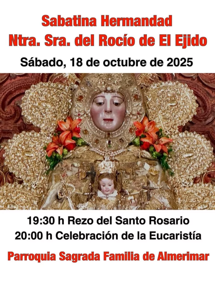Hoy, sábado, 18 de octubre, tendrá lugar la Misa de la Hermandad de Nuestra Señora del Rocío de El Ejido.