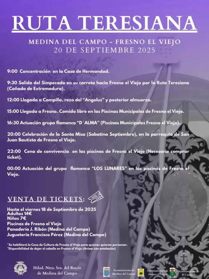 Hoy, sábado, 20 de septiembre, tendrá lugar la salida del Simpecado de la Hermandad de Nuestra Señora del Rocío de Medina del Campo, entronizado en su carreta, siguiendo la ruta teresiana hacia Fresno el Viejo.
