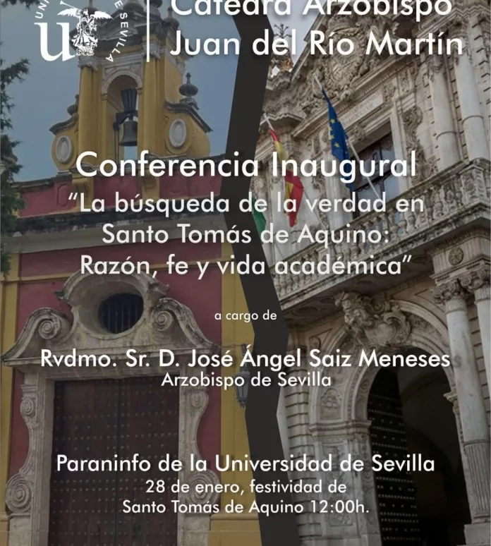 Hoy, el Paraninfo de la Universidad de Sevilla acogerá a las doce del mediodía la conferencia «La búsqueda de la verdad en Santo Tomás de Aquino: razón, fe y vida académica», a cargo del arzobispo de Sevilla, monseñor José Ángel Saiz Meneses, quien con ella inaugura esta cátedra. Un acto de libre acceso, al que es posible asistir hasta completar su aforo.