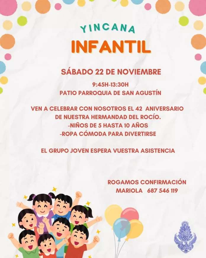 Podrán participar en la Yincana niños con edades comprendidas entre los 5 y 10 años, y disfrutar de la convivencia y del juego divertido celebrando el 42 aniversario de la Hermandad.