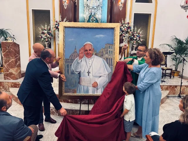 Durante la presentación, Bernadette Alcalde Macías compartió con los presentes la profunda experiencia espiritual y creativa que acompañó la creación del cuadro, agradeciendo a la Hermandad la oportunidad de expresar su devoción a través del arte. La artista destacó que en su obra ha querido reflejar “la ternura del rostro del Santo Padre y esa sonrisa que siempre le acompaña”.