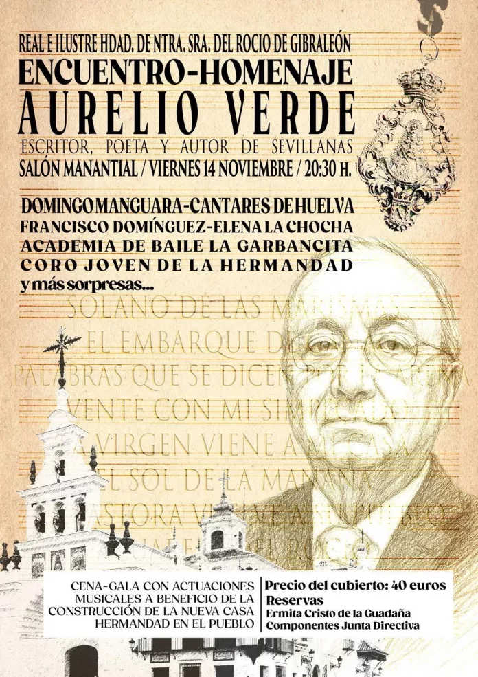 El conocido escritor, poeta y autor de se sevillanas, Aurelio Valverde, será homenajeado por la Hermandad de Nuestra Señora del Rocío de Gibraleón.