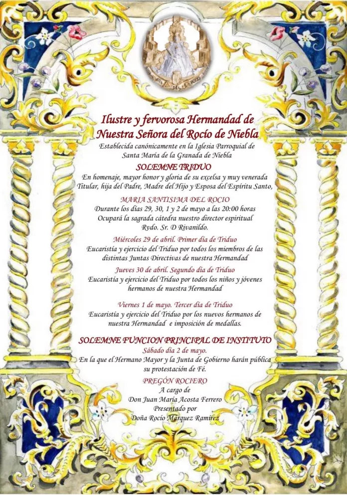 NIEBLA | Redacción Periódico Rociero | La ciudad de Niebla se prepara para vivir sus días más intensos de fe y devoción. La Ilustre y Fervorosa Hermandad de Nuestra Señora del Rocío inicia hoy, miércoles 29 de abril, su Solemne Triduo en homenaje, mayor honor y gloria de su Excelsa Titular, en una Iglesia Parroquial de Santa María de la Granada que ya respira el ambiente inconfundible de las vísperas de Pentecostés.