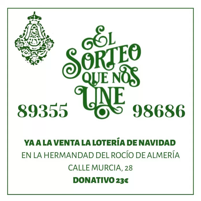 Para este sorteo, la Hermandad de Nuestra Señora del Rocío de Almería, tiene disponibles dos números: El 89.355 y el 98.686.