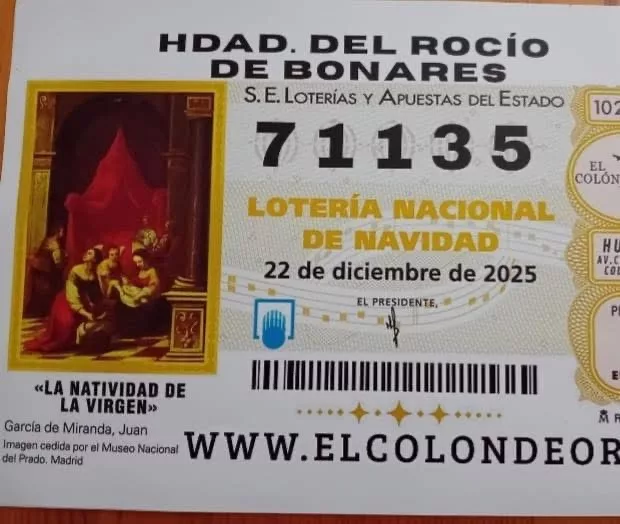 La Hermandad de Nuestra Señora del Rocío de Bonares tiene a disposición de sus hermanos, vecinos de la localidad, y cuantos lo deseen, décimos con el número 71.135, para el sorteo de la Lotería de Navidad del presente año 2.025.