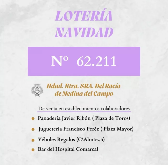 Para participar en el mismo, la Hermandad de Nuestra Señora del Rocío de Medina del Campo tiene a disposición de los hermanos y de cuantas personas lo deseen, los décimos con el número 62.211.