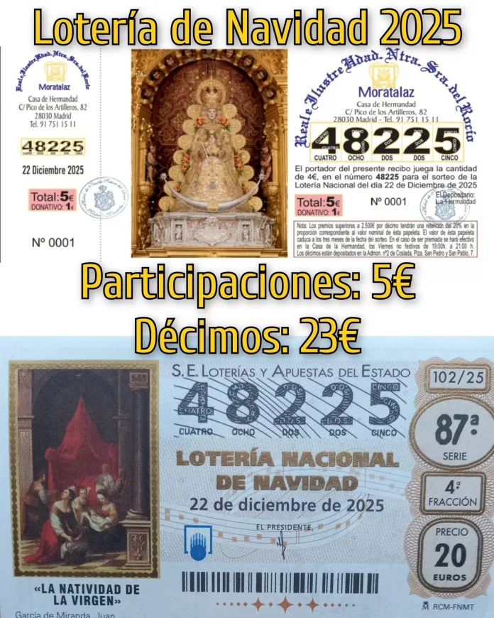 Para este sorteo, la Hermandad de Nuestra Señora del Rocío de Moratalaz-Madrid, ha puesto a la venta décimos y participaciones con el número 48.225, que están a la venta en la sede de la Hermandad y a través de los miembros de la Junta de gobierno.