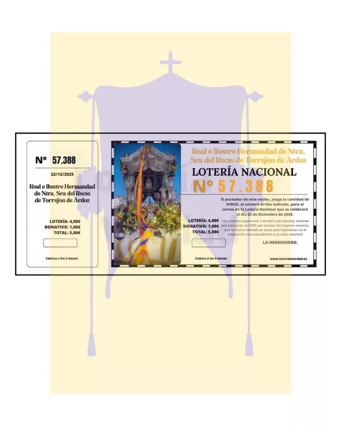 Con el número 57.388, la Hermandad de Nuestra Señora del Rocío de Torrejón de Ardoz participará en el sorteo de la Lotería de Navidad del 22 de diciembre.
