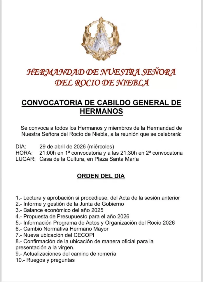 NIEBLA | Redacción Periódico Rociero | La Real e Ilustre Hermandad de Nuestra Señora del Rocío de Niebla ha hecho oficial la convocatoria de su Cabildo General de Hermanos, una cita fundamental en el calendario de la corporación iliplense para organizar la inminente Romería de 2026.