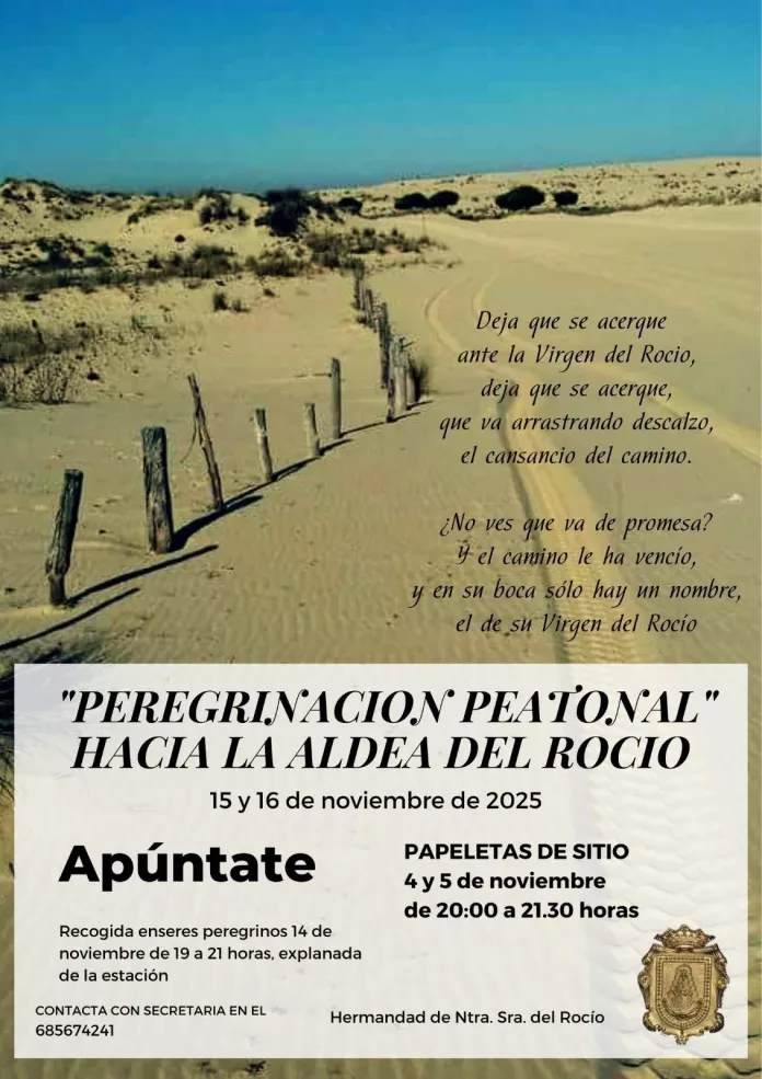 Esta se celebrará durante los días 15 y 16 de noviembre, peregrinando a pie desde Sanlúcar de Barrameda a la Aldea almonteña, y culminará en la ermita ante la Blanca Paloma.