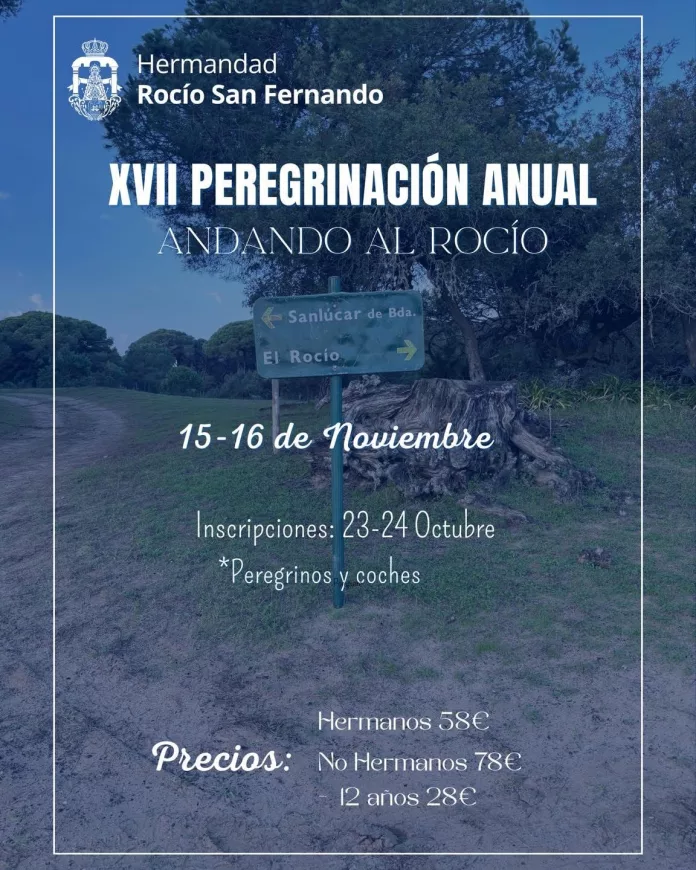 Los días 15 y 16 de noviembre tendrá lugar la peregrinación anual peatonal de la Hermandad de Nuestra Señora del Rocío de San Fernando, atravesando el Coto de Doñana.
