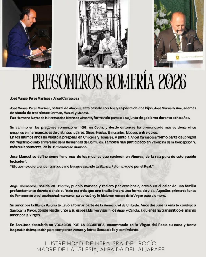 La Junta de gobierno de la Hermandad de Nuestra Señora del Rocío de Albaida del Aljarafe ha designado a las personas que tendrán a su cargo el pregón de la romería de 2.026.