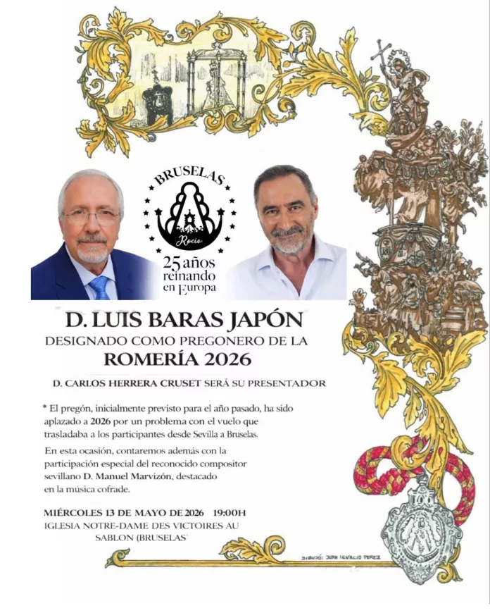 La Junta de gobierno de la Hermandad de Nuestra Señora del Rocío de Bruselas ha nombrado pregonero de la romería 2.026 a Luis Baras Japón, conocido periodista, pregonero y conferenciante.