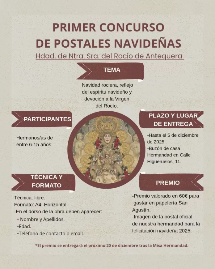 La Hermandad de Nuestra Señora del Rocío de Antequera ha puesto en marcha su primer concurso de postales navideñas, dirigida a los hermanos con edades comprendidas entre los 6 y 15 años.