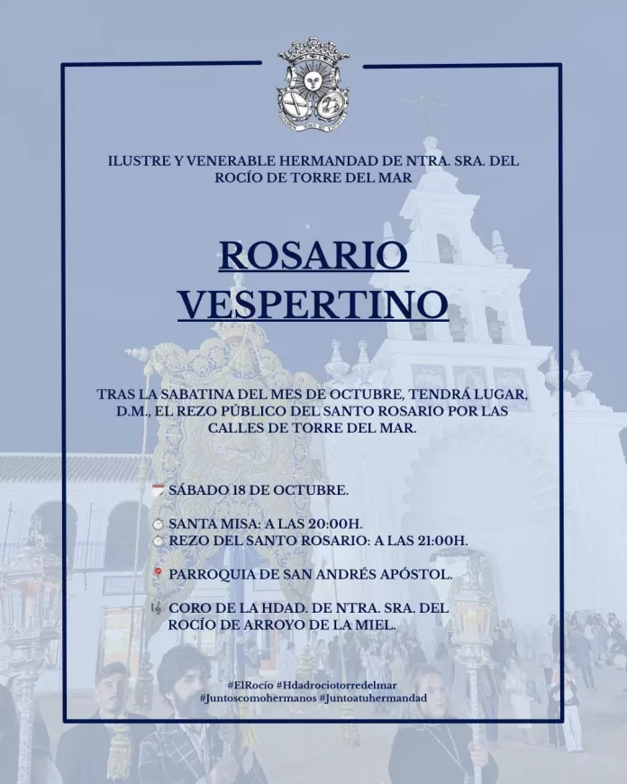 La Hermandad de Nuestra Señora del Rocío de Torre del Mar celebrará mañana, sábado, 18 de octubre, un Rosario vespertino público por las calles de la localidad.