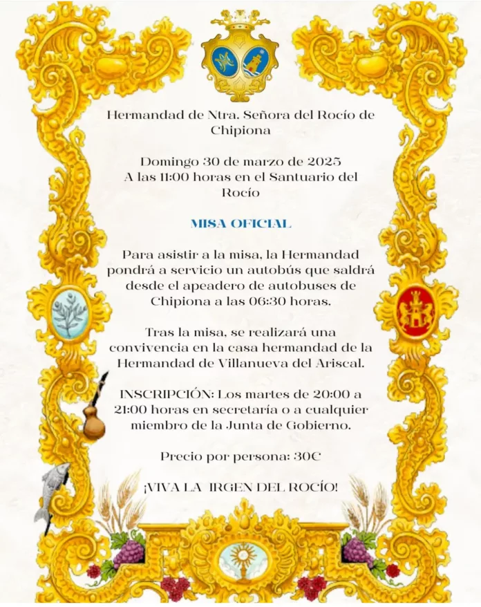 El próximo domingo, 30 de marzo, a las 11 de la mañana, tendrá lugar la Misa correspondiente a la peregrinación oficial de la Hermandad de Nuestra Señora del Rocío de Chipiona a las plantas de la Blanca Paloma.