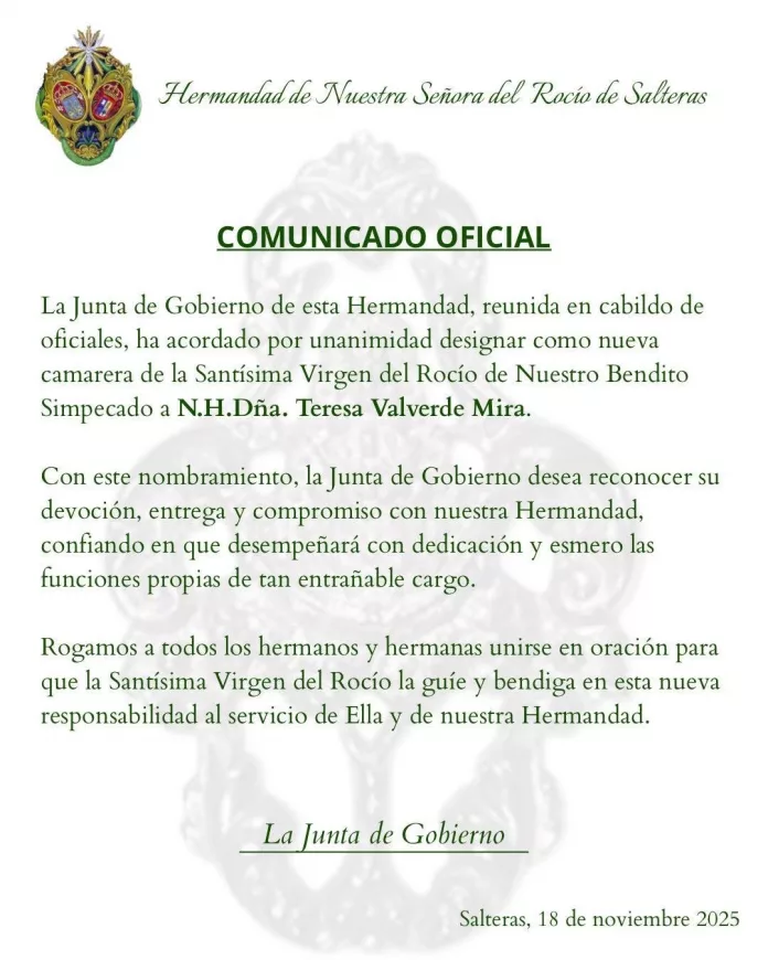 La Junta de gobierno de la Hermandad de Nuestra Señora del Rocío de Salteras ha designado a Teresa Valverde Mira nueva camarera de su Simpecado.